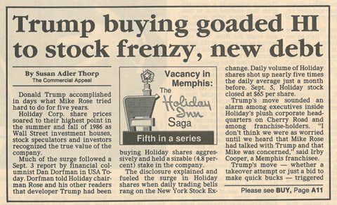 While Holiday Inns is regularly cited as evidence of how Memphis innovators changed American culture, the Trump role is largely forgotten. The stock frenzy that he triggered when he bought about five percent of Holiday Inn’s stock in 1986 made him $32 million, almost the amount of the payroll – $40 million – that evaporated from the Memphis economy.