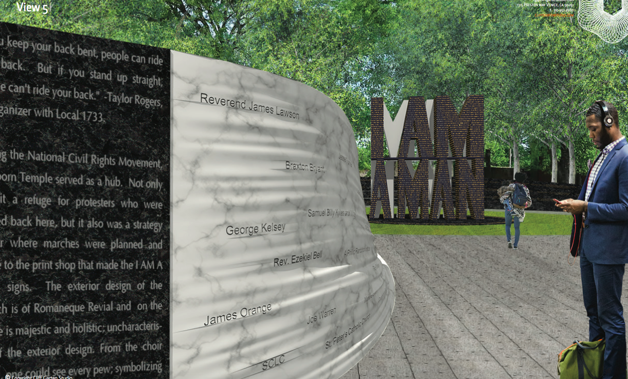 The plaza, to be opened for the 50th commemoration, is designed by Cliff Garten Studio of Venice, California, and celebrates Memphis home-grown heroes:  protesting sanitation workers.  Their names will be etched onto two curved walls framing the centerpiece – an oversized sculpture of the iconic placard carried by protesters: I AM A MAN.