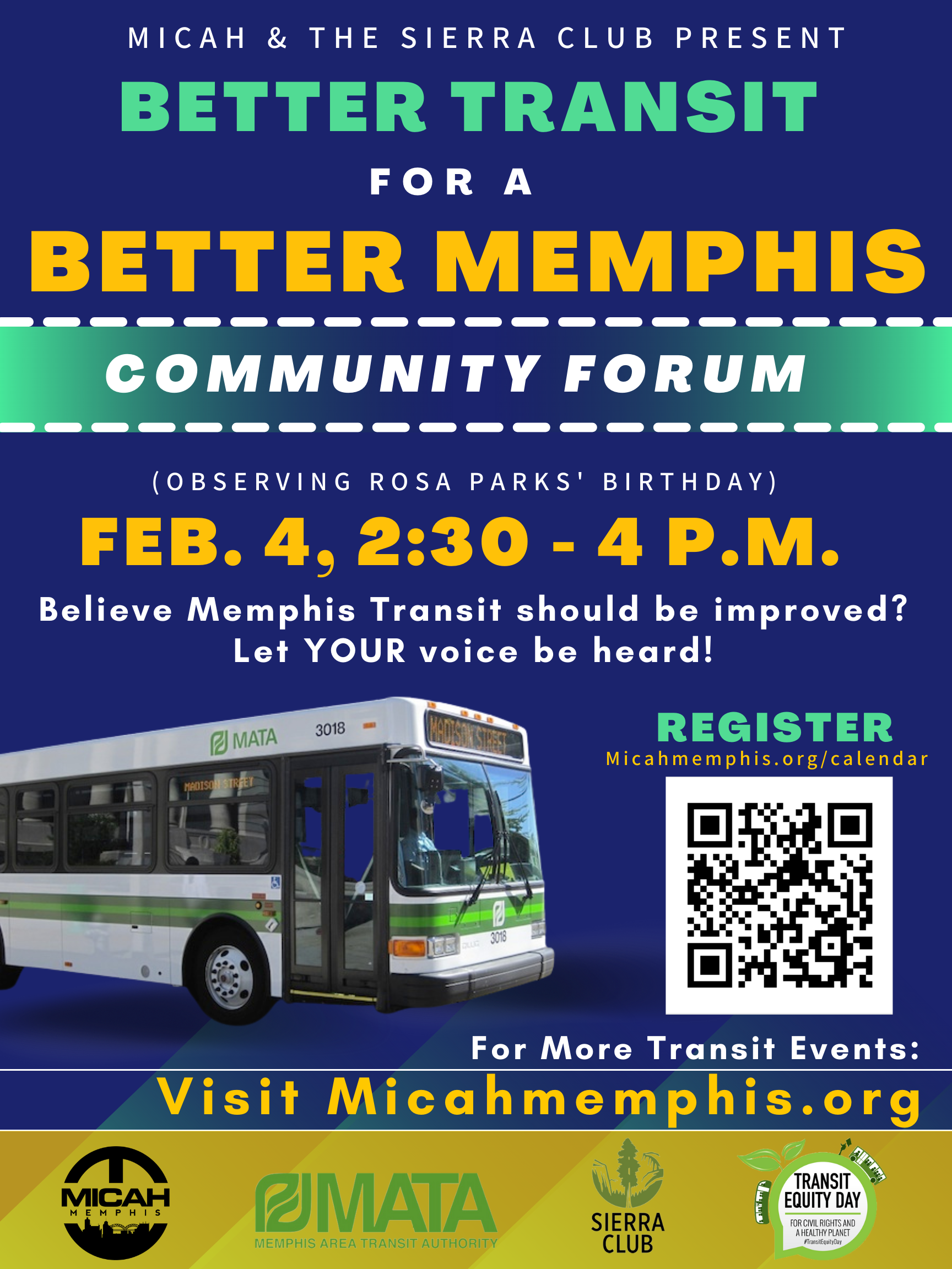 Transit Equity Day is Friday, February 4, which is Rosa Parks’ birthday. It is national Day of Action for equity and for transit. The Sierra Club and MICAH ((Memphis Interfaith Coalition for Action and Hope) have organized an online Community Forum for that day.
